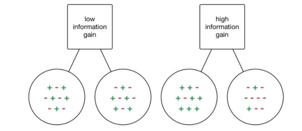 如果我们要选择一个拆分,其中每个输出都有一个依赖于数据的类组合,那么,我们实际上根本没有获得任何信息;我们不知道是否存在这样的一个特定节点(即特征),对我们的数据分类有任何影响!另一方面,如果我们的拆分对于每个输出的每个类都有很高的百分比,那么我们就会得到这样的信息,即在特定的特征变量上以特定的方式对信息进行拆分,会得到一个特定的输出!