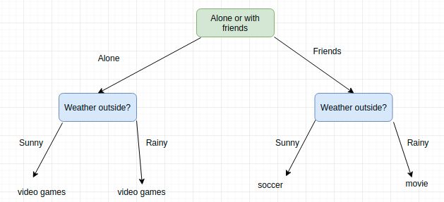 你很可能在自己的生活中,使用过决策树来做出决定。比如说,你决定这个周末应该做什么活动。这可能取决于你是想和朋友一起出去玩儿还是独自过周末;在这两种情况下,你的决定还取决于天气。如果天气晴朗,并且朋友也有空,你可能想踢足球。如果最后下雨的话,你就去看电影。如果你朋友根本不来,那么,无论天气如何,你都会喜欢去打电竞游戏。