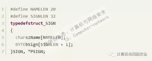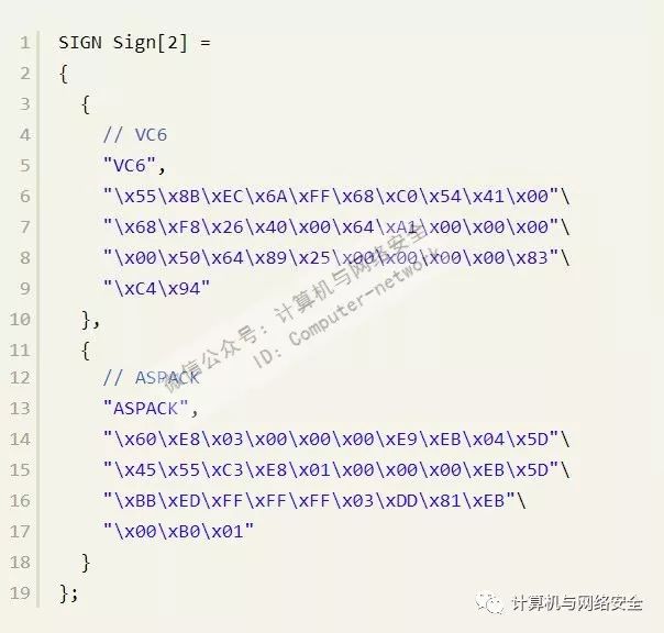 有了这些特征码,就可以开始编程了。先来定义一个数据结构,用来保存特征码,该结构如下: