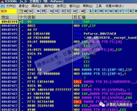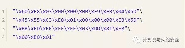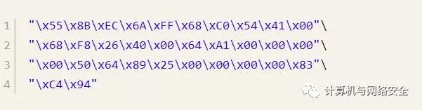 可以看到这就是未加壳程序的入口处代码,在图4中,“十六进制”列中就是代码对应的十六进制编码,我们就是要提取这些十六进制编码。提取结果如下: