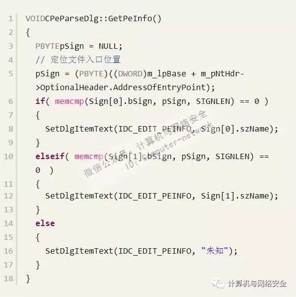 提取了特征码,对于查壳工作就剩特征码匹配了,这个非常简单,只要用文件的入口处代码和特征码进行匹配,匹配相同就会给出相应的信息。查壳的代码如下:
