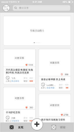 “发现”模块是进入易趣APP首先展示的页面,充当着首页作用,包含搜索、专题活动、闲置物品信息流三大模块,对应“买闲置品”的主场景。