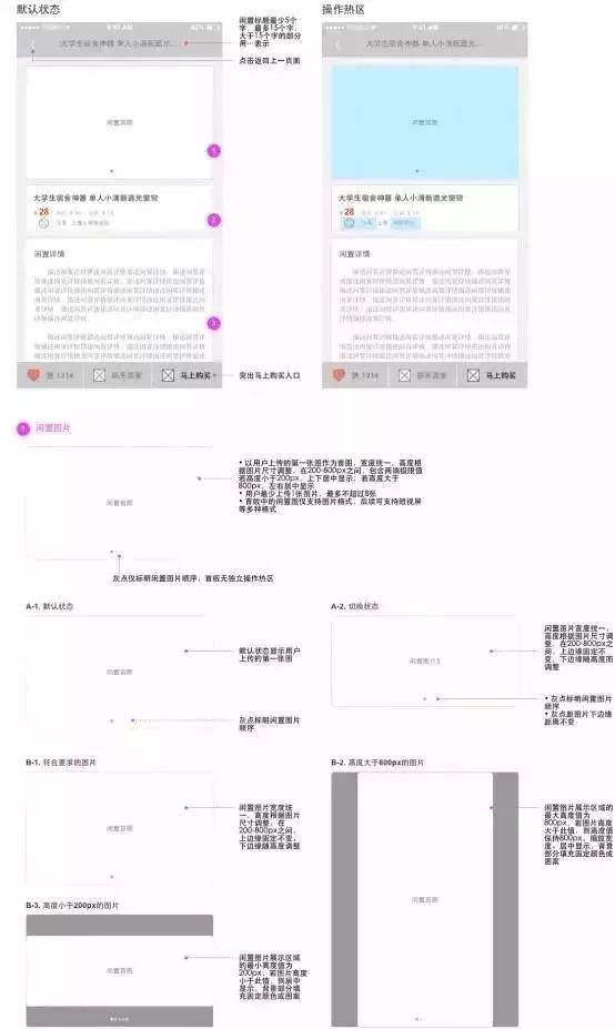 1. 展示闲置详情——闲置信息(信息) 2. 表达支持态度或想收藏闲置物品——点赞(功能) 3. 想直接与卖家沟通闲置细节——联系卖家(入口) 4. 决定购买这件闲置物品——马上购买(入口) 5. 想比较类似的闲置物品,再做决定(后续版本加入)——相关闲置推荐(信息流) |