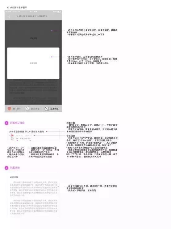 闲置信息包含闲置物品图片、闲置概况集合、闲置详情说明三个部分,方便用户在在短时间内迅速掌握核心信息,并能深入了解细节信息。闲置详细信息展示模块,详见4.2.4.1。