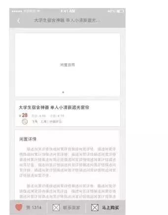 “闲置详情”模块是承载易趣APP“买闲置品”主场景的关键,用于闲置物品的展示、建立买家与卖家的联系,包含闲置详细信息、用户点赞、联系卖家和马上购买四大模块。