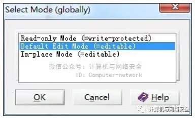 步骤03:选择Options(选项)→Edit Mode(编辑模式)菜单项,即可打开Select Mode(选择模式)对话框,如图23所示。由于WinHex默认是写保护方式的,这里将编辑模式修改为Default Edit Mode(=deitale)(默认的编辑模式(=可编写))选项。