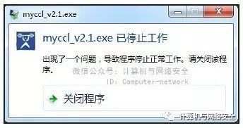 步骤06单击“运行”按钮,即可打开“myccl_v2.1.exe已停止工作”【提示】框,如图48所示。单击“关闭程序”按钮,即可中断myccl_v2.1.exe程序。