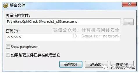 步骤21:同理,如果想解密文件,则在UltraEdit主窗口中选择“文件”→“加密”→“解密文件”菜单项,即可打开“解密文件”对话框,如图20所示。在其中选择要解密的文件并输入设置的密码,单击“确定”按钮,即可进行解密操作。