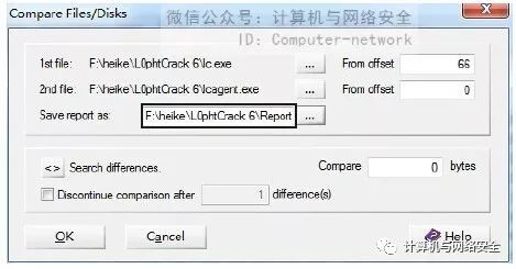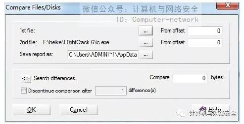步骤07:利用WinHex软件还可以对文件进行连接、分割、合并、不可逆转删除和比较等操作。在解密时经常用到的功能是比较,即通过比较解密前后的文件看出解密者对程序中的哪些代码做了修改,最后生成一个文本方式差别报告。在WinHex主窗口中选择Tools(工具)→Files Tools(文件工具)→Compare(比较)菜单项,即可打开Compare File/Disks(比较文件/硬盘)对话框,如图31所示。