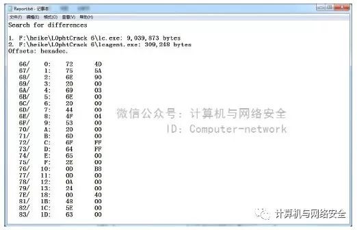 步骤12:当系统完成文件的比较之后,将会产生一个文本文件,从中可以看到不同代码处的偏移地址、代码内容和差别总数等信息,如图37所示。