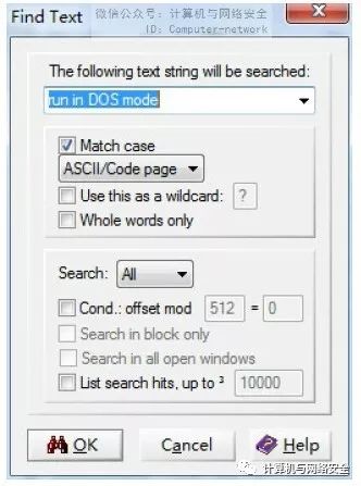 步骤05:使用WinHex还可以搜索出一些程序内的字符串,并且可以对它们进行编辑。在WinHex主窗口中选择Search(搜索)→Find Text(查找文本)命令,即可打开Find Text对话框,在其中输入需要修改的字符串,如run in DOS mode,将搜索方式设置为ASCII/Code page选项,如图29所示。