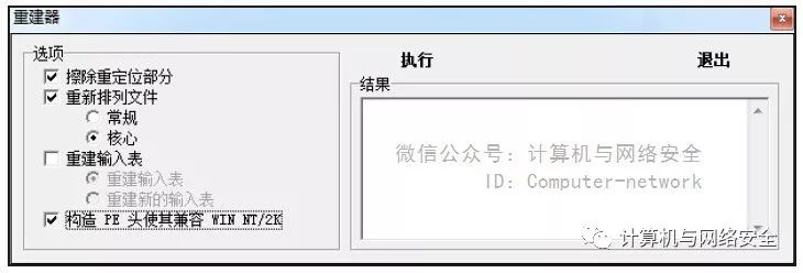 步骤10:在PEditor 1.7主窗口中单击“重建程序”按钮,即可打开“重建器”对话框,在其中勾选相应的复选框,如图53所示。单击“执行”按钮,即可重建打开的应用程序,如图54所示。