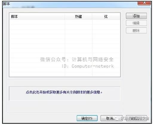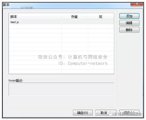 步骤15:如果想在UltraEdit工具中插入并使用已经存在的脚本文件,则在UltraEdit主窗口中选择“脚本”→“脚本”菜单项,即可打开“脚本”对话框。在其中可进行添加、编辑、删除脚本操作,如图14所示。