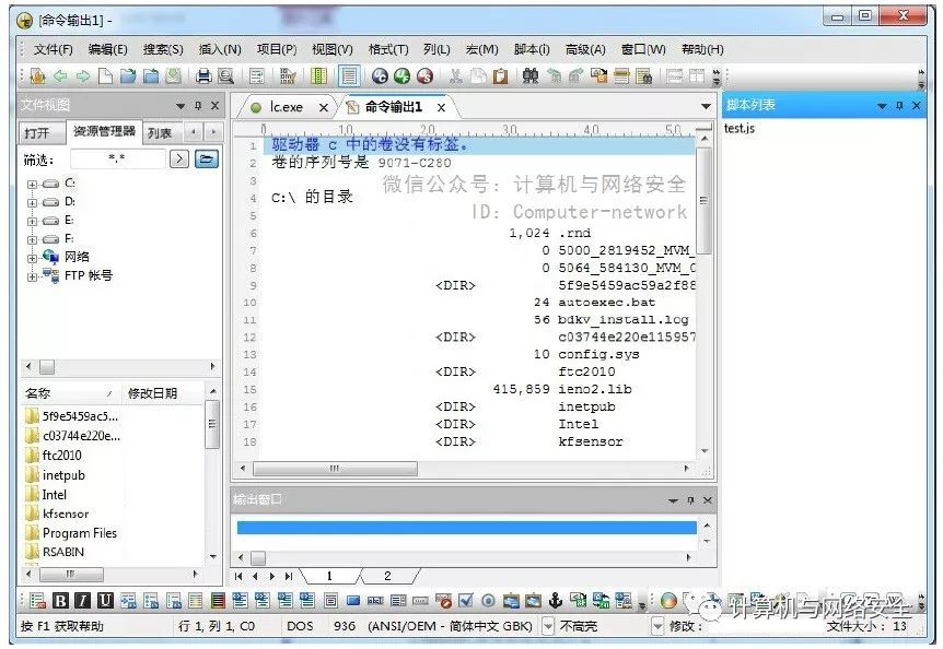 步骤11:在“命令”文本框中输入Dos命令,如dir、ping等,单击“确定”按钮,即可在UltraEdit主窗口的编辑区中看到该命令的具体执行结果。利用这项功能可以截取Dos窗口运行的文本信息,如图10所示。