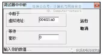 步骤05:在PEditor 1.7主窗口中单击“调试器中中断”按钮,即可打开“调试器中中断”对话框,在“虚拟地址”文本框中输入虚拟地址,如图47所示。