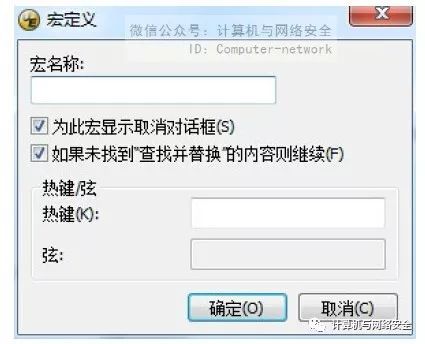 步骤14:UltraEdit工具还可以编辑和使用宏,在使用宏之前需要先定义宏。在UltraEdit主窗口中选择“宏”→“录制”菜单项,即可打开“宏定义”对话框,如图13所示。在其中输入宏的名称和热键后,单击“确定”按钮,即可录制宏。