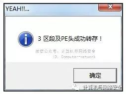 步骤04:在PEditor 1.7主窗口中单击“分割节”按钮,即可打开“3区段及PE头成功转存”【提示】框,如图46所示。单击“确定”按钮,即可转存3区段和PE头文件。