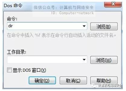 步骤10:在UltraEdit软件中还可以直接调用DOS和Windows命令。在UltraEdit主窗口中选择“高级”→“DOS命令”菜单项或按F9键,即可打开“Dos命令”对话框,如图9所示。