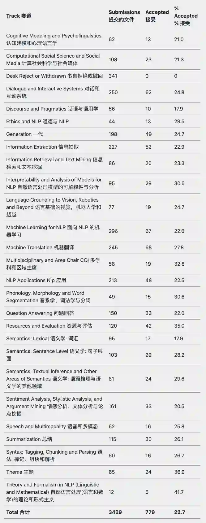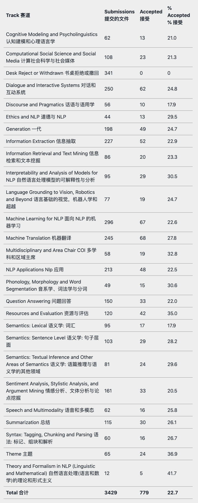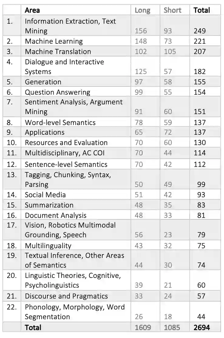 是前五个最受欢迎的研究方向,每个方向都有超过 200 个提交。值得一提的是,今年单就 NLP 的机器学习一条赛道就有近 300 篇论文(296 篇)提交,要知道 acl 2002 当年所有方向加起来总共才只收到 258 份论文提交!可见 NLP 领域的迅速发展。