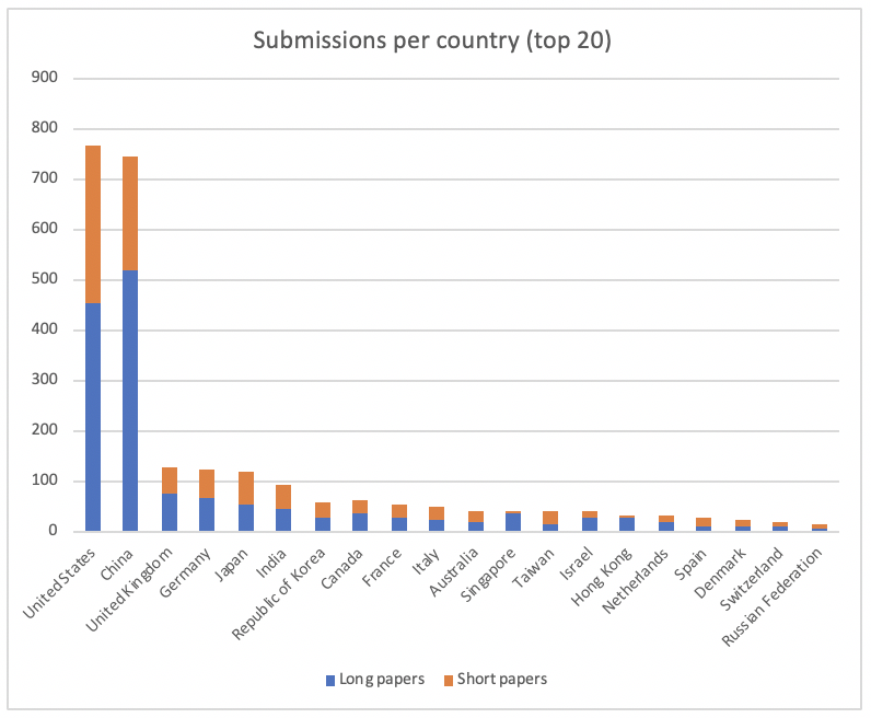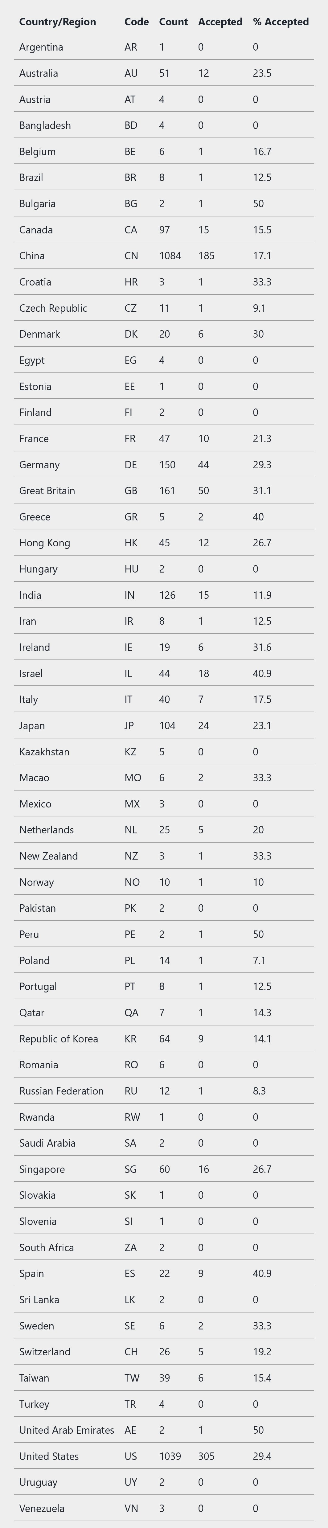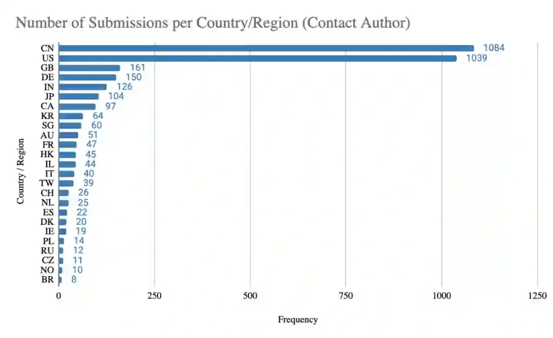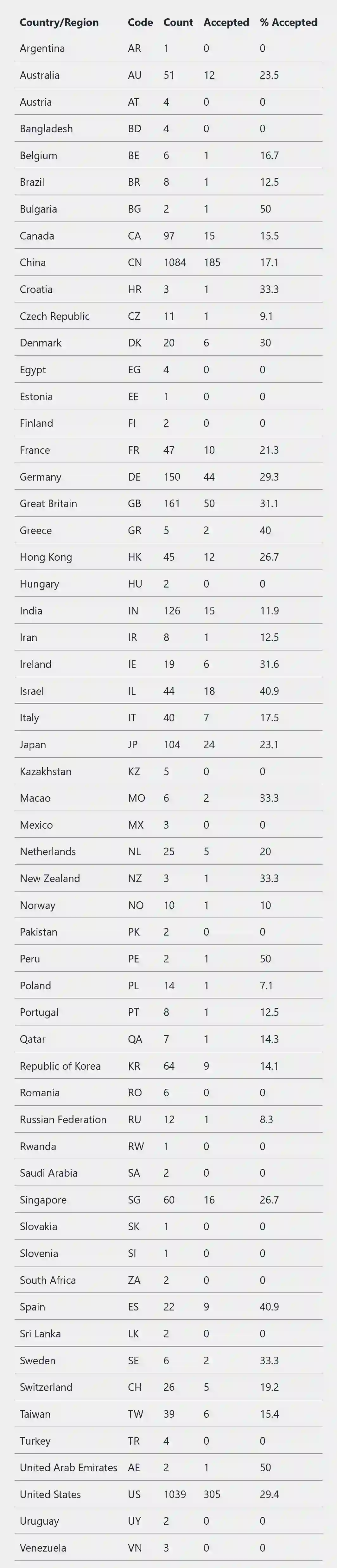 不过在被接收数方面,中国只有 205,比美国少了 100 篇。中国接收率 17.5% 遗憾未进前十,美国则未进前五。被接受论文最多的五个国家是美国(305)、中国(205)、英国(50)、德国(44)和日本(24)。如果我们考虑在提交的数量的前 15 个国家/地区,接受率最高的是以色列(40.9%)、英国(31.1%)、美国(29.4%)、德国(29.3%),香港和新加坡(两者都有 26.7%)。