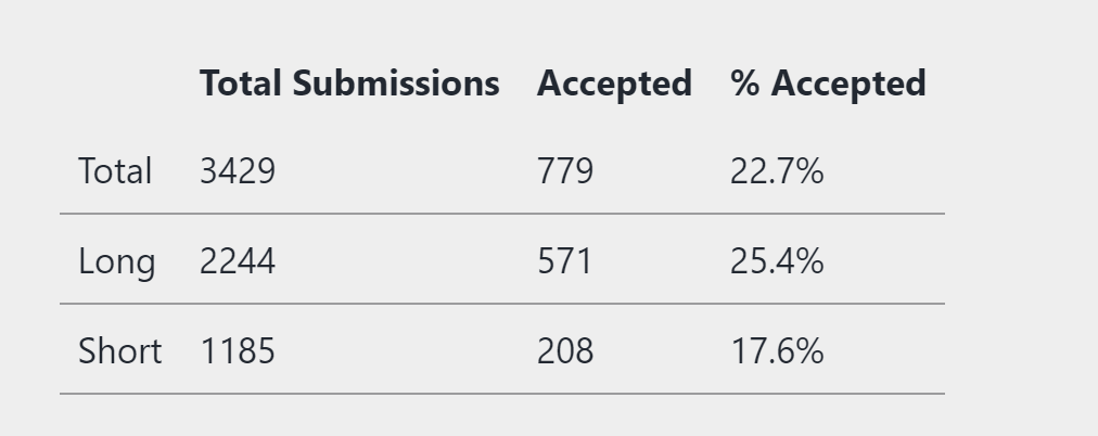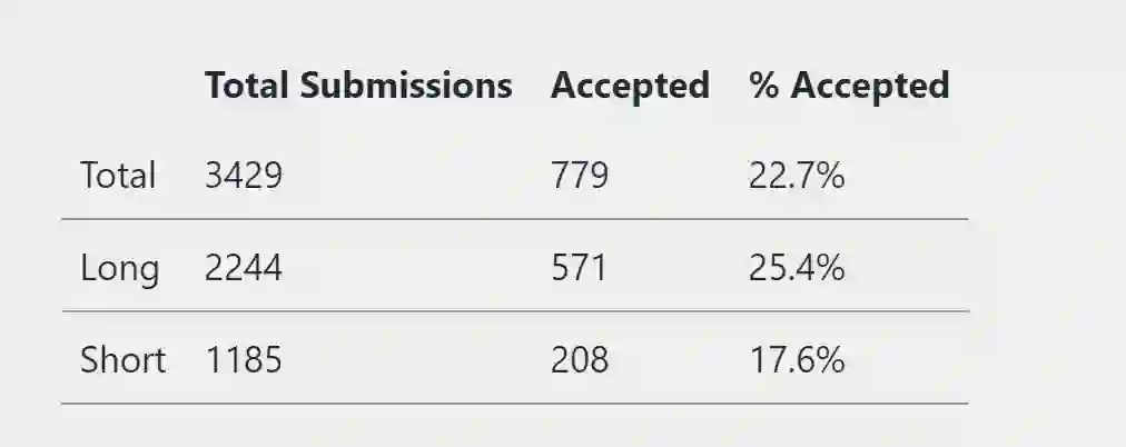 此外,本次接收的论文数量也创了历史新高,共有 779 篇被接收,其中有 571 篇是长论文,而 208 篇是短论文。如果将 29 篇直接被拒和 312 篇撤回的排除在外,接收率为 25.2%。但如果加上直接被拒和撤回的,接收率只有 22.7%,跟去年持平。