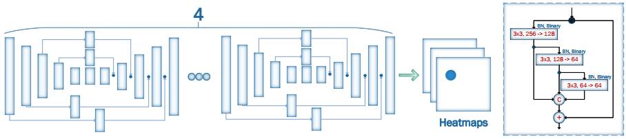 2D-FAN结构:通过堆叠四个HG构建的人脸对齐网络(Face Alignment Network ,FAN),其中所有的 bottleneck blocks(图中矩形块)被替换为新的分层、并行和多尺度block。
