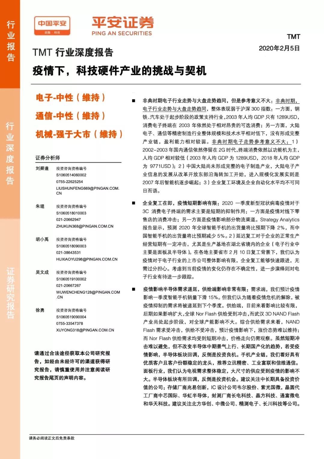 平安证券发布《疫情下,科技硬件产业的挑战与契机》报告,内容如下: