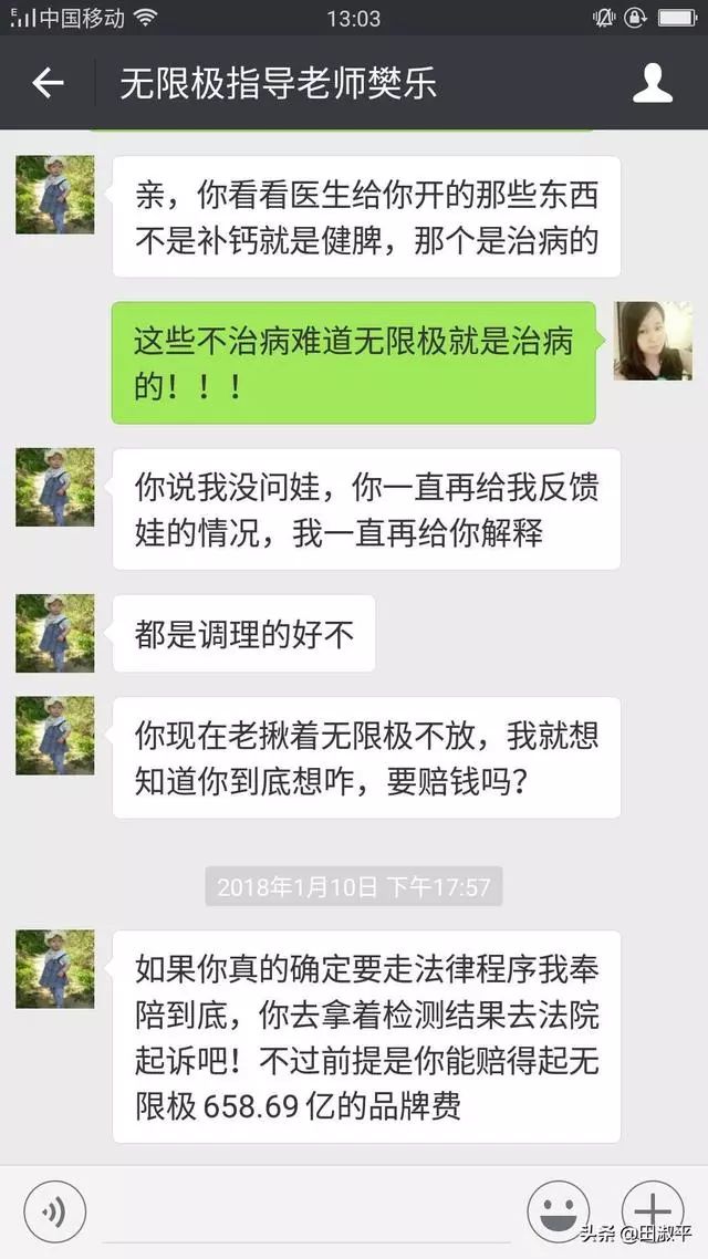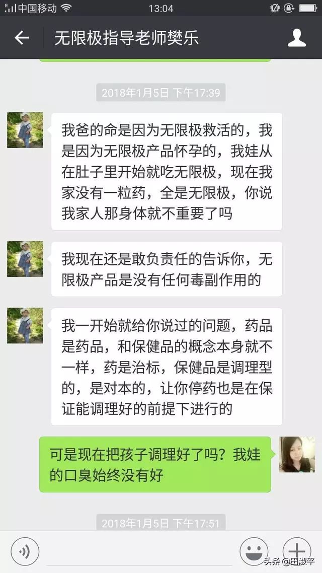 期间,樊乐告诉她,孩子要多喝水,这个症状是调理引起的正常反应,让不要停,继续服用无限极病就好了,不然就前功尽弃。樊乐还告诉她,无限极产品是没有任何毒副作用的,“我爸的命是因为无限极救活的,我是因为无限极产品怀孕的,我娃从在肚子里开始就吃无限极……”。