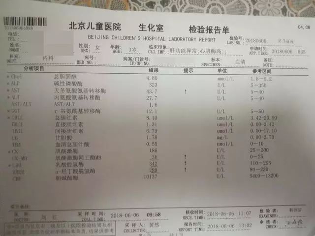 “田淑平”在网上贴出多张图片,包含女儿在西京医院的门诊病历、商洛市中心医院和北京儿童医院生化检验报告单。其中北京儿童医院的临床诊断为“肝损伤;心肌损害”。西京医院诊断为“心肌损害;低血糖肝损害原因待查;药物蓄积”。