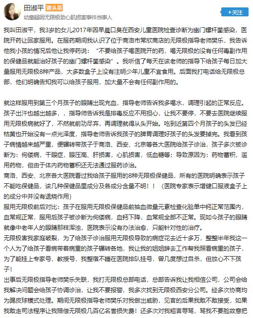1月16日下午,一位在今日头条认证为“幼童疑因无限极致心肌损害事件当事人田淑平”的网友曝出,其3岁女儿被诊断为“幽门螺杆菌感染”后,在陕西当地一位“无限极指导老师樊乐”推荐下,每日大量服用无限极8种产品,后被多家医院诊断为心肌损害、低血糖等病症。
