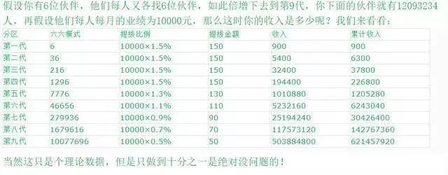 在公司分红方面,无限极规定了“六六模式”的拉人头方式。也就是说,哪怕当月一分钱产品都没有卖出去,只靠发展下线人头,就能拿到收入。发展1296人,月提成收入就可达到22.68万元。