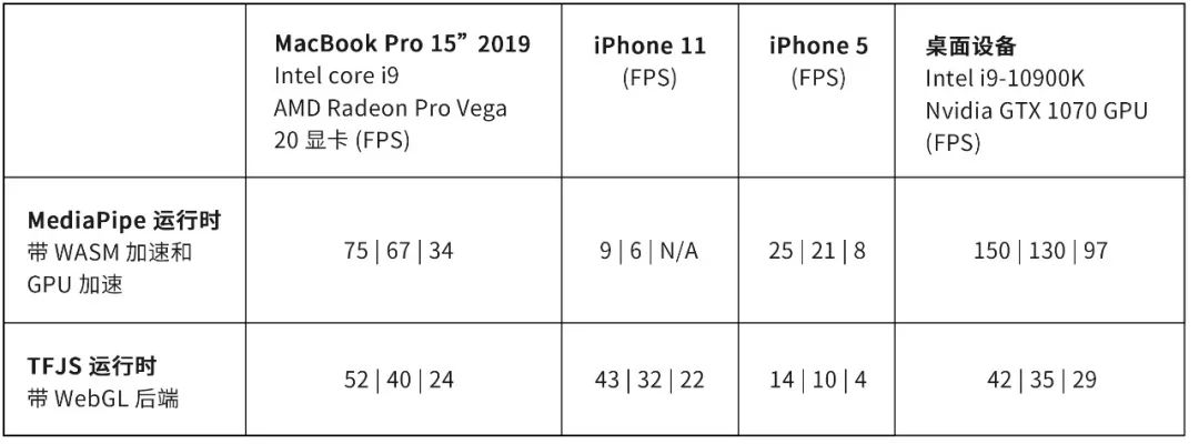 使用每种运行时都有优点和缺点。如下面的性能表所示,MediaPipe 运行时在桌面设备、笔记本电脑和 Android 手机上的推断速度较快。TF.js 运行时在 iPhone 和 iPad 上的推断速度较快。TF.js 运行时也比 MediaPipe 运行时小了大约 1 MB。