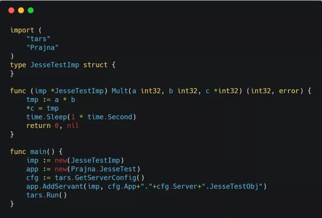 接着生成接口代码。使用 tars2go JesseTest.tars 即可自动生成 pacakge Prajna JesseTest 的 servant 和 Mult 方法的框架实现,业务无需关心实现细节: