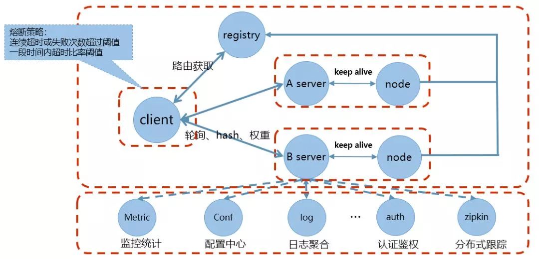 为了更及时地屏蔽故障节点,Client 根据调用被调服务的异常情况判断是否有故障来更快地进行故障屏蔽。具体策略是,当 Client 调用某个服务器出现调用连续超时超过设置阈值,或者调用的超时比率超过一定百分比阈值,Client 就会对此服务器节点进行屏蔽,让流量分发到正常的节点上去。对屏蔽的服务器节点,每隔一定时间进行重连,如果正常,则进行正常的流量分发。