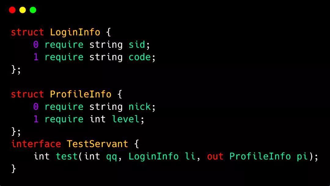 Tars 协议是一个二进制协议,它是与语言无关的IDL语言,由工具自动生成服务端和客户端代码,下边是一个 Tars 协议的示例: