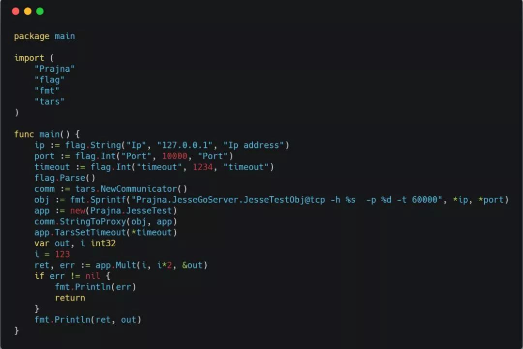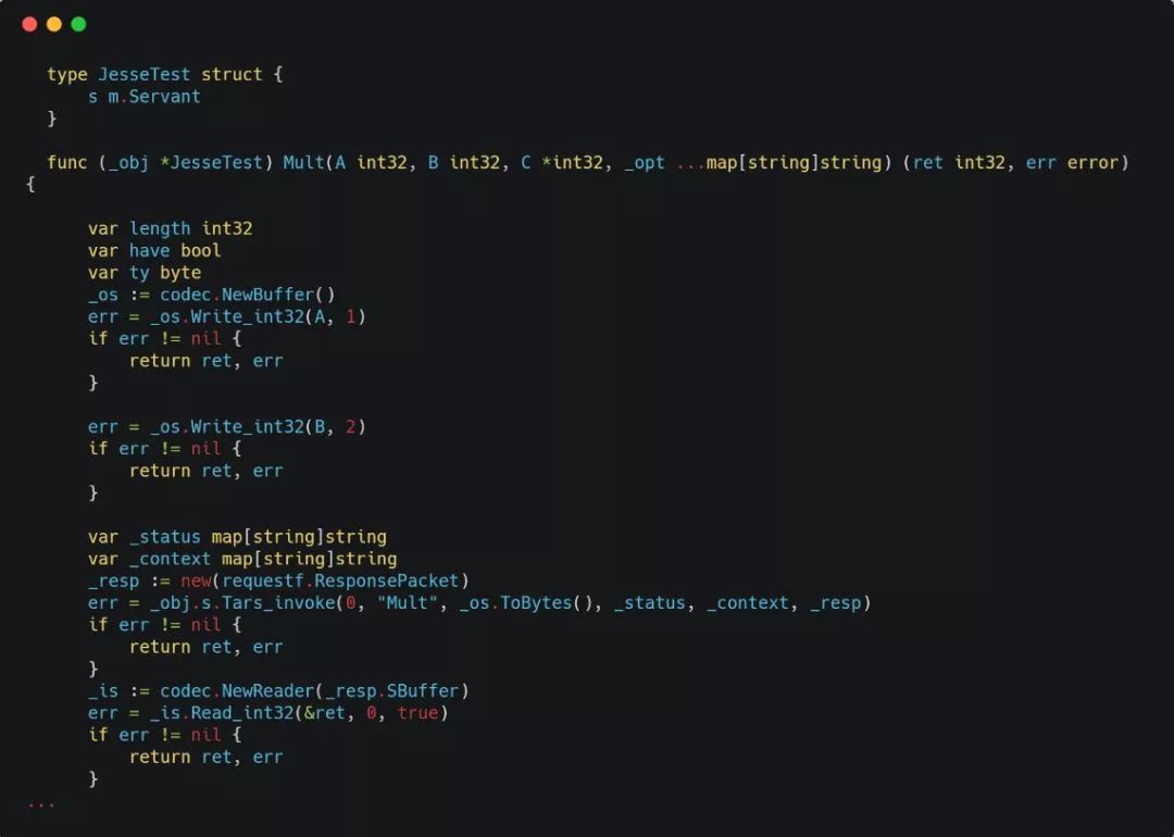 而客户端只需关注出入参,引入由 Tars 文件转化成的包即可完成一次 RPC 调用。