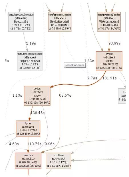 从下图可以看出,有相当大的一部分时间耗在了 slice 相关的操作上,原来在包的编解码过程中,使用 bytes.Buffer 进行临时存放,当 bytes.Buffer 底层用的 byte slice 大小不够的时候,就会分配一定的内存空间,频繁地分配效率很低,所以导致大包情况下性能下降比较明显。