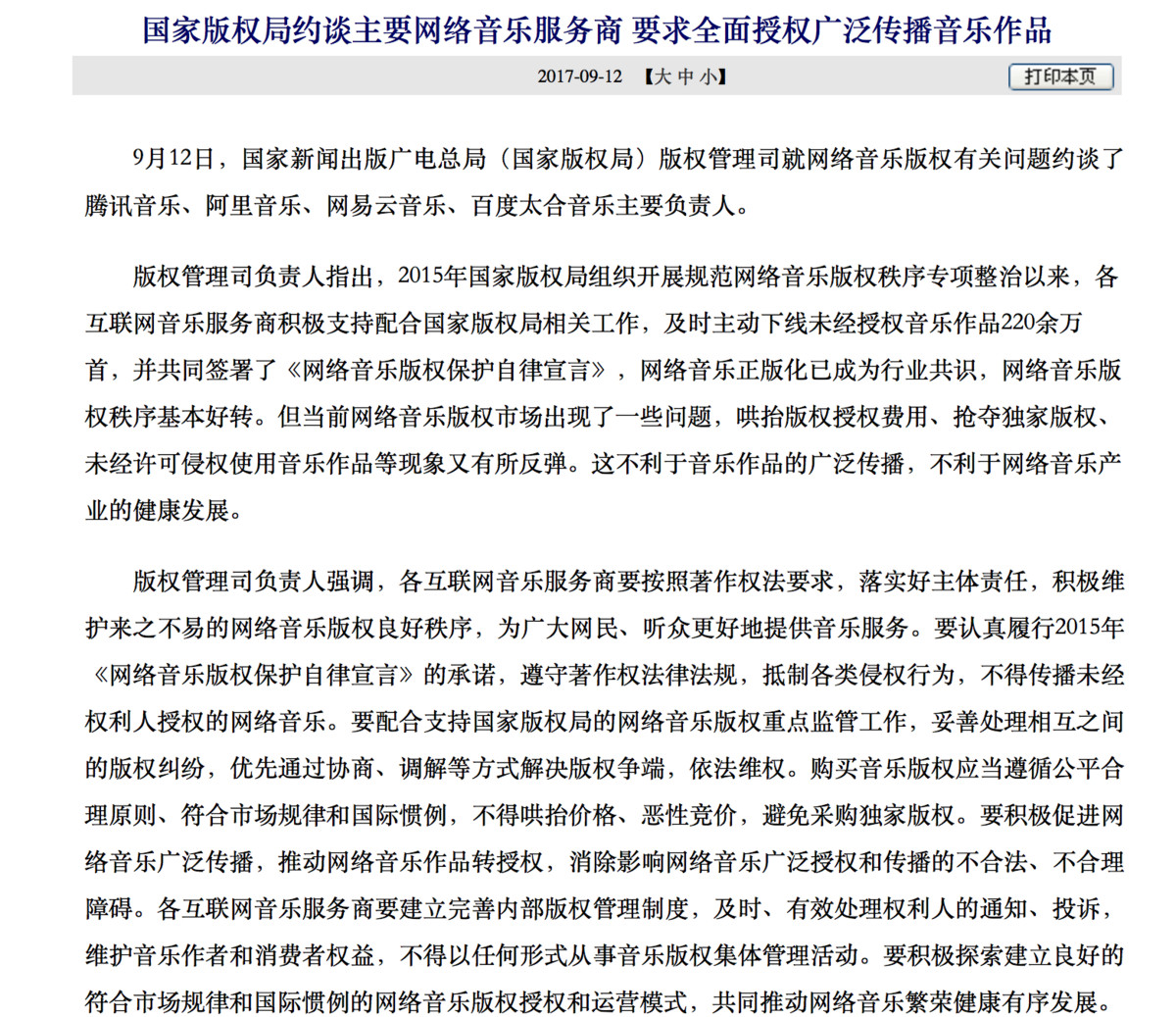 但就在吃瓜群众感慨「心疼网易云音乐」的时候,事情急转直下,同一天,国家版权局发布了一则通告。