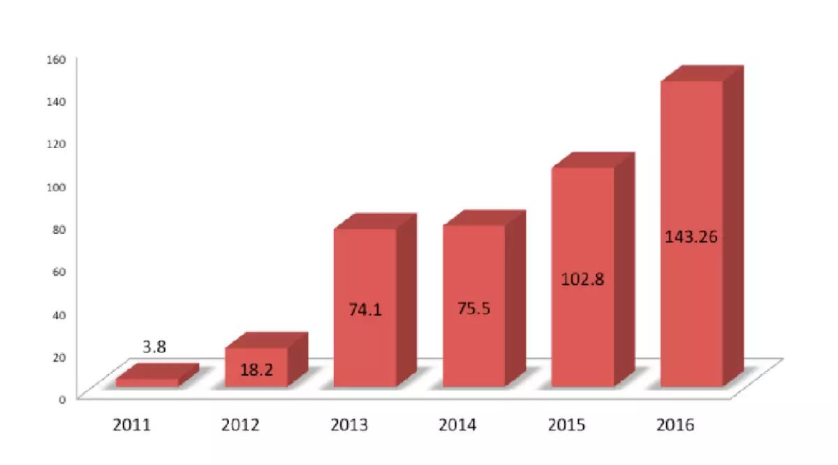 中国数字音乐产值规模,数据来源《2017中国数字音乐市场发展报告》