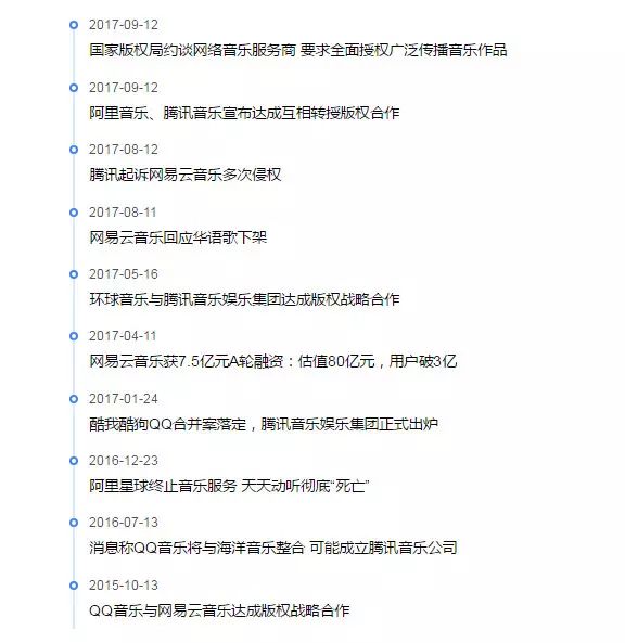 两年前,国家版权局发布了《关于责令网络音乐服务商停止未经授权传播音乐作品的通知》,各家音乐平台短时间内一共下架了 220 万首的未经授权的音乐作品,史称“最严版权令”;在此之后,音乐平台瞄上了正版音乐这块大蛋糕,版权大战开始打响,小的公司抵挡不住这股浪潮,或消亡或被合并,马太效应愈发明显。