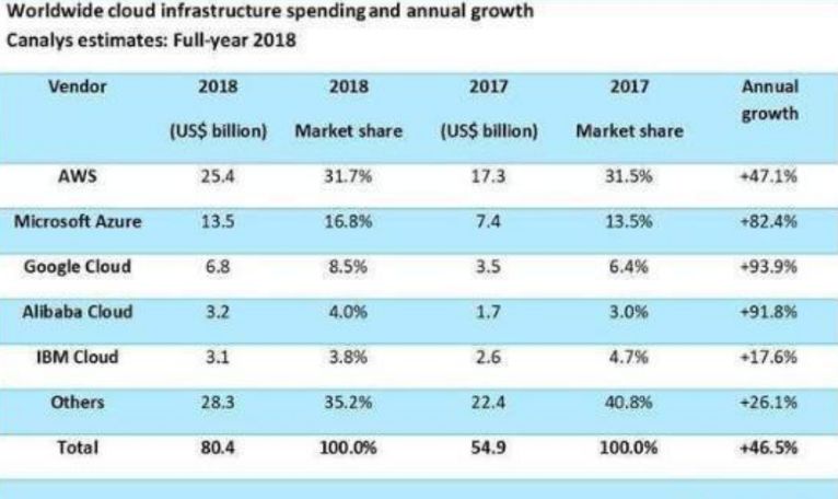 2018年,AWS以254亿美元的营收已经占据了全球云计算市场的31.7%,Azure也已经拥有了超过16.8%的市场份额。Google Cloud依旧排名第三,营收68亿美元,市占率8.5%。而来自中国的阿里云则以32亿美元应收和4%的市占率排名第四。甲骨文并未傍上有名,只能跟其他企业瓜分剩余的市场份额。