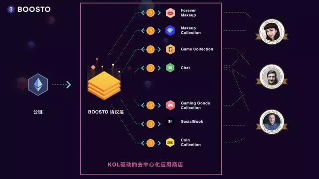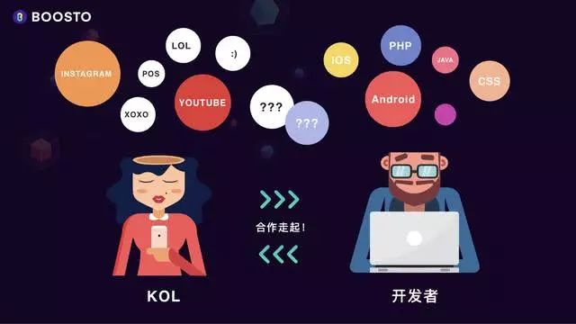 BOOSTO, 是由KOL和全球粉丝驱动的分布式应用商店,是在主流公链上开发的协议层,为全球开发者提供工具,数据库和流通数字货币BST,让应用轻松上链,同时被全球35万KOL个性化分发给20亿粉丝,精准的关系定制化推荐机制,解决了流量和转化率问题。开发者开发的应用可以单独使用,也可以跟任何的应用组合使用,用户不需要多重注册。在每一个应用里的所有收入,都可以按照智能合约里的比例约定,公证公开透明的分给开发者、KOL和粉丝,中心化的应用商店的重赋,将不复存在。