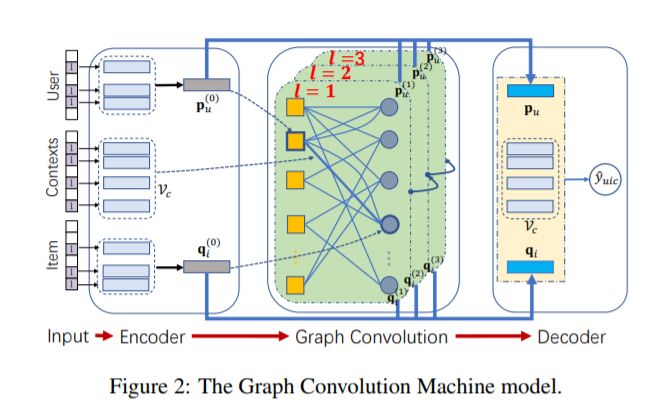 推荐的最新进展表明,可以通过在用户项目交互图上执行图卷积来学习更好的用户和项目表示形式。但是,这种发现主要限于协作过滤(CF)场景,在该场景中无法使用交互上下文。在这项工作中,我们将图卷积的优势扩展到了上下文感知推荐系统(CARS,代表了可以处理各种辅助信息的通用类型的模型)。我们提出了图卷积机(GCM),它是一个由以下组成的端到端框架:三个组件:编码器,图卷积(GC)层和解码器。编码器将用户,项目和上下文投影到嵌入向量中,然后将其传递到GC层,以利用上下文感知的图卷积在用户项图中对用户和项目嵌入进行细化。解码器通过考虑用户,项目和上下文嵌入之间的交互,提取经过精炼的嵌入以输出预测分数。我们对Yelp的三个真实数据集进行了实验,验证了GCM的有效性以及对CARS执行图形卷积的好处。