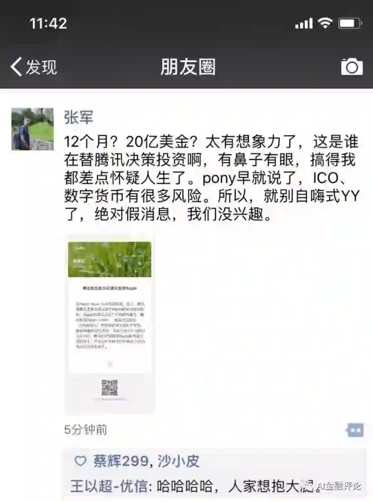 而在本文发稿前不久,雷锋网·AI金融评论记者在微信朋友圈看到腾讯公关总监张军发布了针对该新闻的回应,称“太有想象力了,绝对假消息”。