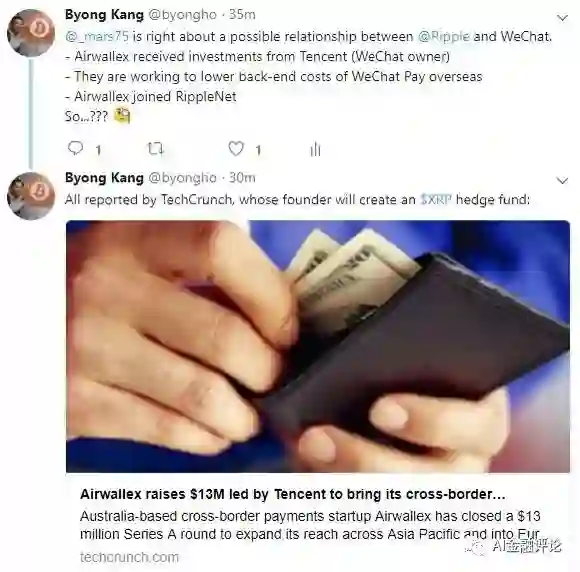 为此,“andrejones”举出一大例证。2017年5月,跨境支付公司Airwallex空中云汇获得1300万美元的A轮融资,腾讯是领投方,红杉中国和Mastercard万事达跟投(注:有传闻称万事达与Ripple有合作关系)。据当时媒体报道,投资Airwallex是腾讯战略布局跨境支付的动作之一。当时,二者已在海外微信收单等业务方面展开合作。