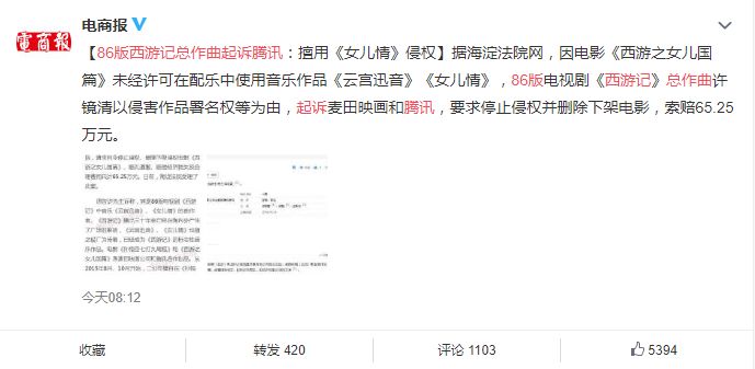 据中国新闻网 86版电视剧《西游记》总作曲许镜清近日以侵害作品署名权、作品信息网络传播权纠纷为由,将北京麦田映画文化传媒有限公司、深圳市腾讯计算机系统有限公司诉至法院。许镜清称,电影《西游之女儿国篇》未经许可在配乐中使用自己的音乐作品《云宫迅音》《女儿情》,请求法院判令对方停止侵权、删除下架侵权电影《西游之女儿国篇》、赔礼道歉、赔偿经济损失及合理费用共计65.25万元。