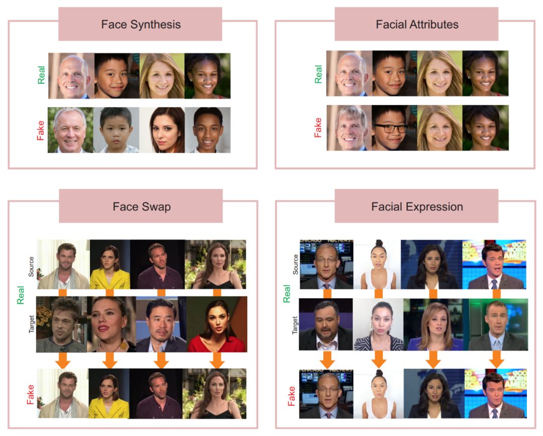 人脸合成:通常利用强大的 GAN(如近期的 StyleGAN 方法)创建完全不存在的人脸。这些技术获得了惊人的结果,其生成的高质量人脸图像栩栩如生。图 1 展示的人脸合成样本即通过 StyleGAN 生成;