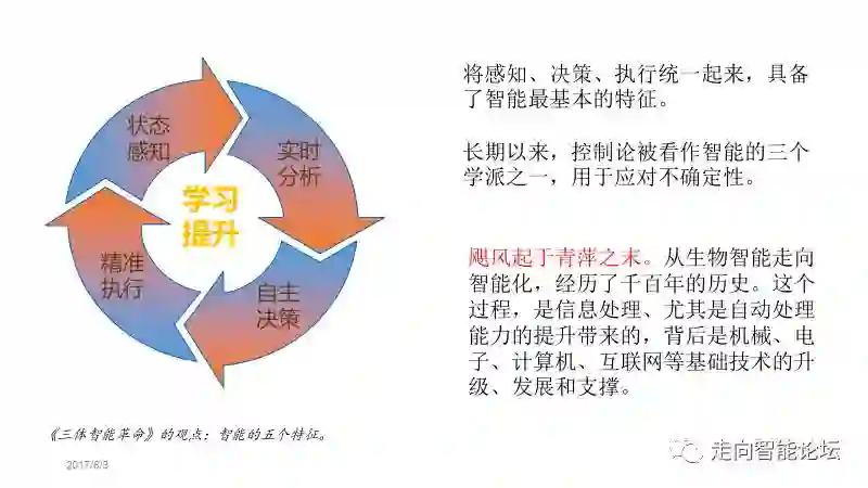 在《三体智能革命》一书中,把(一般性的)“智能”归结为20个字、5个要点:状态感知、实时分析、自主决策、精准执行、学习提升。由此看来,控制论被做为人工智能的三个学派之一是有道理的:它强调了上述5个要点中最基本的三个:感知、决策与执行。