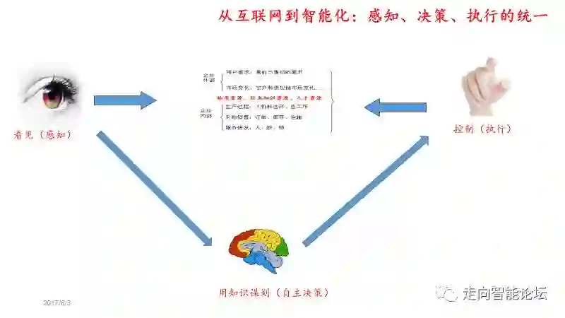 “感知、决策和执行的统一”是控制论的逻辑、是自动化的逻辑、也是智能制造的逻辑。逻辑是老的逻辑,但内涵不一样了。现在,大量的信息可以数字化、被计算机处理;大量的对象和流程,可以用计算机来模型化;我们可以感知和控制全球的资源。在新的技术环境下,数据的跨越时空的流动就像汽车在高速公路上一样方便,而不是各种“断头路”。这样,信息处理的机制从量变走到了质变,从而带领我们进入了智能时代。