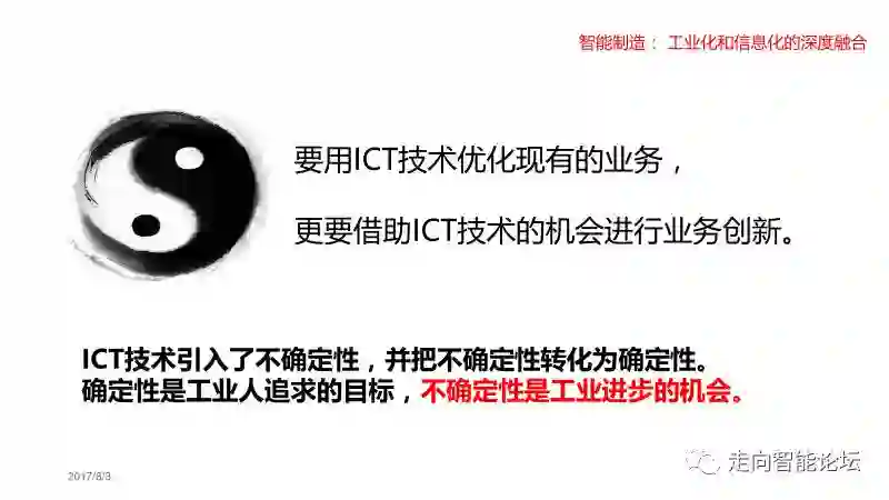 在我看来,所谓的“深度融合”就是:ICT技术要适应制造业的特点,还要用ICT技术改变制造过程。是双向的,不是单向的。长期以来,真正懂IT的人都知道:IT的技术服从于业务的需求。这一点,决定IT项目的成败。但是,走入智能化时代的时候,这个原则受到一定的挑战。
